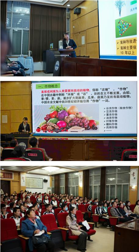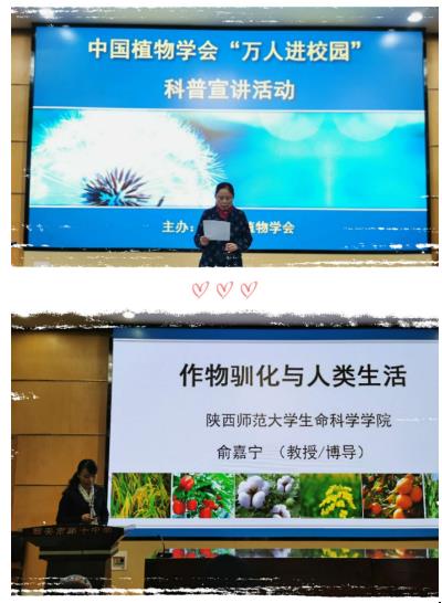 最后,俞嘉宁教授为西安市第十中学的高一学子们、生物教研组全体教师和西安市首批高中生物名师+成员做了《作物驯化与我们的生活》专题讲座。西安市第十中学罗庆军校长亲自为俞嘉宁教授颁发了“生物教育公益讲座科普活动”指导专家聘书。俞嘉宁教授从作物概念、为什么要进行作物驯化、作物驯化培育的历程、转基因作物、转基因作物的安全性这五个方面进行了科普宣讲。俞教授结合生活实例、利用大量的直观图片,浅显易懂的让学生对进化知识有了一个基本的模型,对后续学习《遗传与进化》这本书奠定了基础,同时也让学生对生活中的生物学知识有了全新的认知,老师和同学们都受益良多!